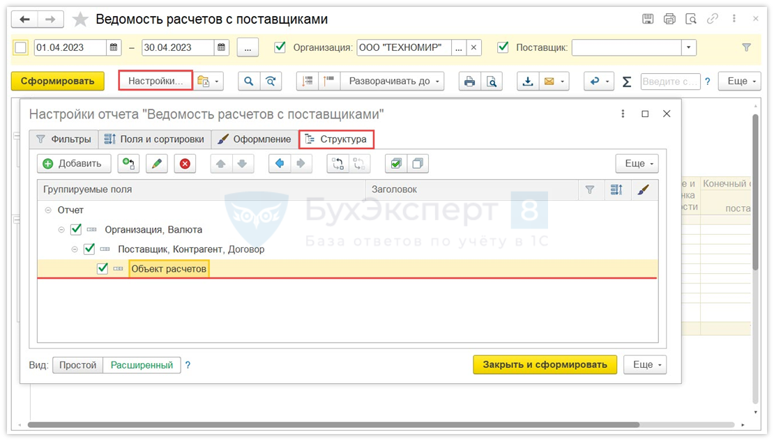 Для более детального анализа нажмите кнопку Настройки и на вкладке Структура установите флажок Объект расчетов.