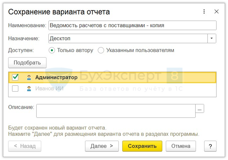 Сохраните с произвольным наименованием. Укажите, каким пользователям доступен отчет, добавьте описание.