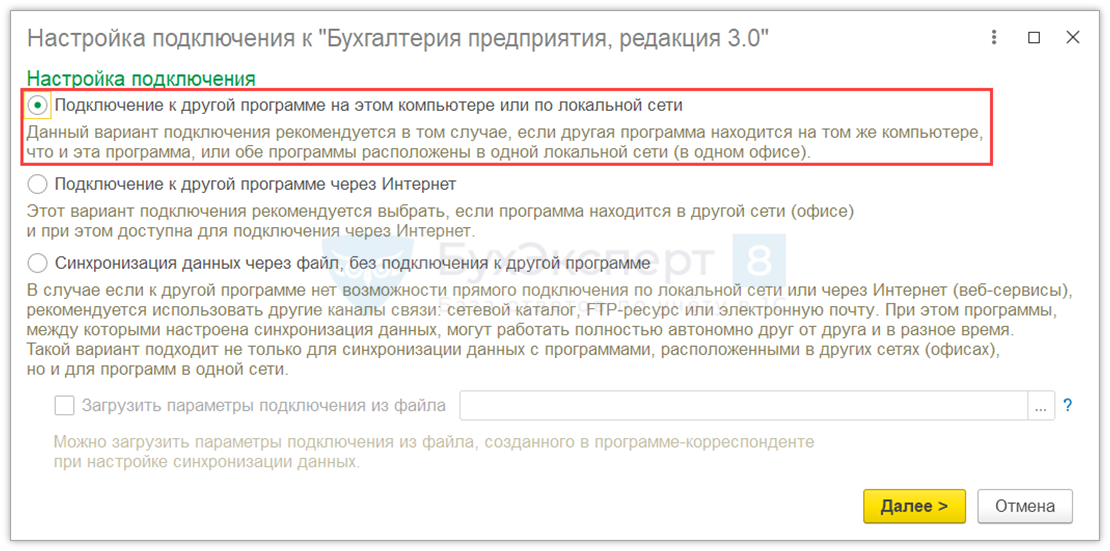 В нашем примере используем синхронизацию по первому варианту, когда 1С УТ и БП расположены на одном компьютере. Выберите первый пункт и нажмите Далее.