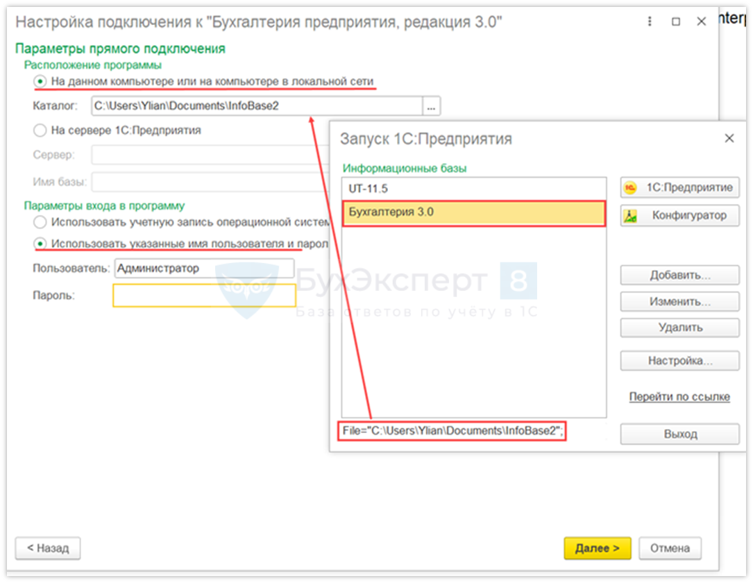 Укажите путь к базе БП и Пользователя и нажмите кнопку Далее.