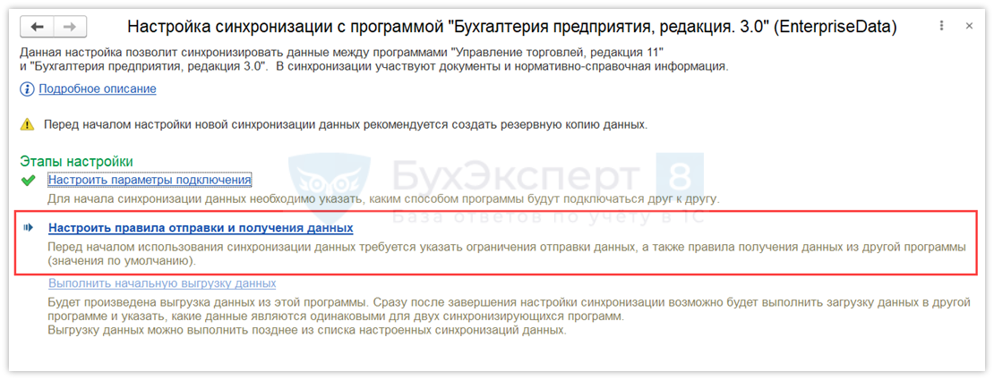 Для продолжения настройки необходимо выбрать пункт Настроить правила отправки и получения данных.