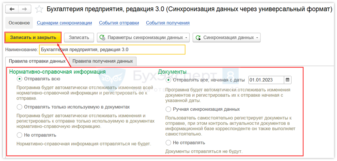 Выберите режим обмена нормативно-справочной информацией и документами. В нашем примере выбран режим Не отправлять. Затем нажмите Записать и закрыть.