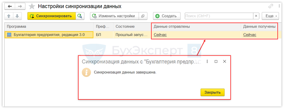 Дождитесь окончания синхронизации. В результате обмена УТ получит данные от БП и произведет запись в раздел Данные отправлены и Данные получены.