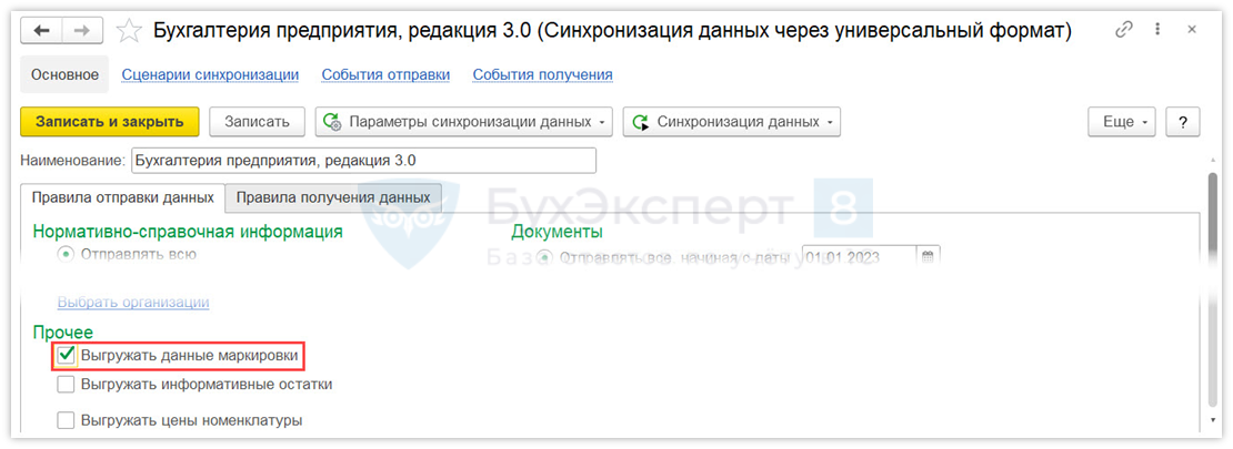 Настройка выгрузки данных по маркировке при синхронизации между БП и УТ