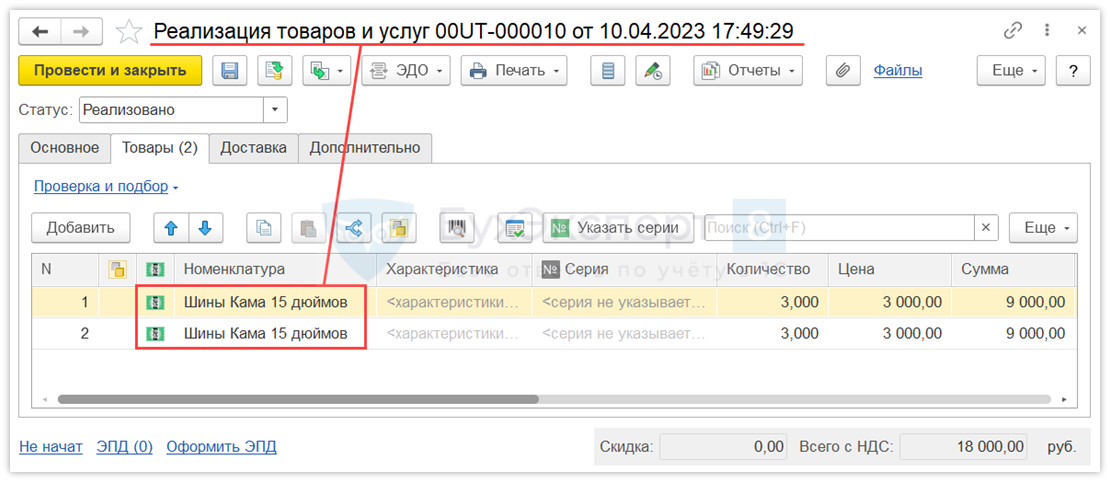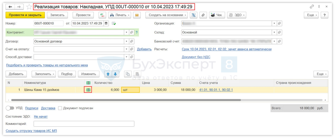 Документ Реализация товаров и услуг выгружен в 1С Бухгалтерия 8. Реквизиты документа, товарный состав и коды маркировки отражены корректно.