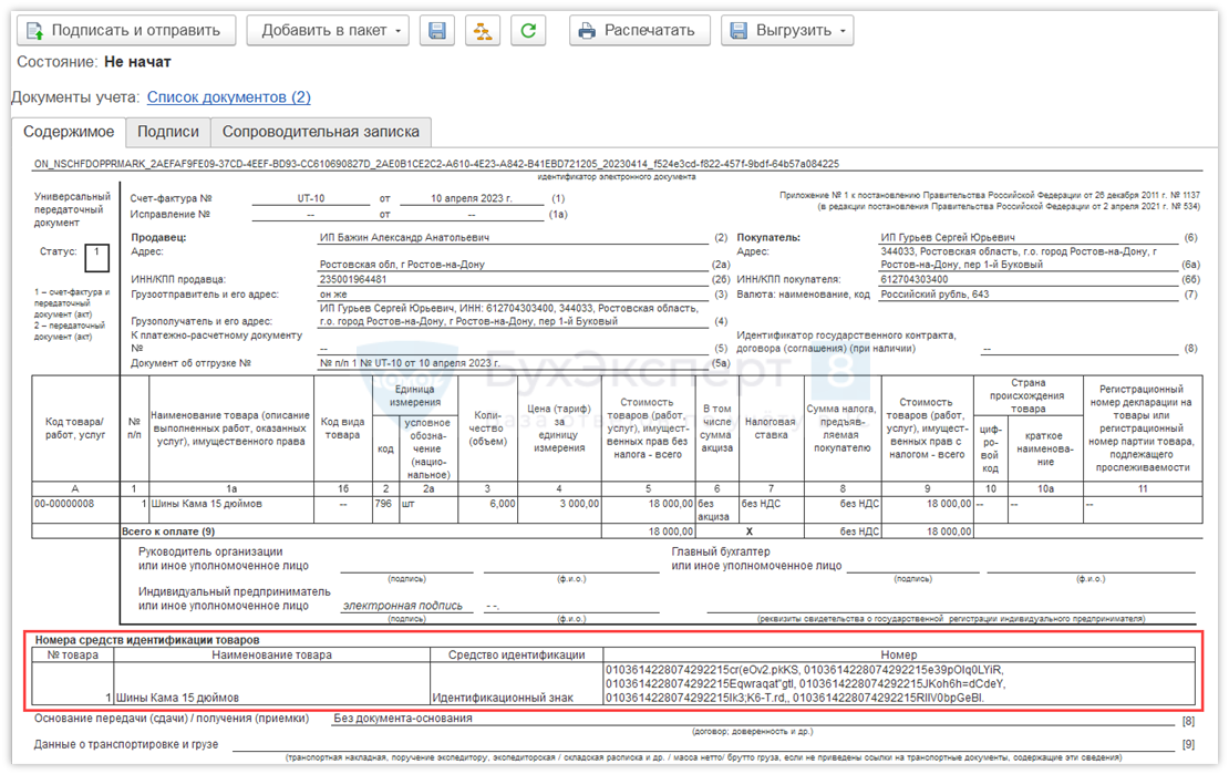 Результат передачи кодов маркировки можно увидеть, если сформировать электронный УПД через меню ЭДО — Просмотреть электронный документ.