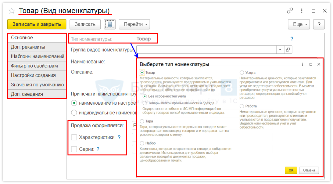 - задает дополнительные параметры для справочника Номенклатура (характеристики, серии);