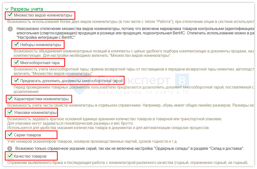 - определяет для справочника Номенклатура особенности ведения учета (алкоголь, маркированный товар, товар ВЕТИС и т.д.);