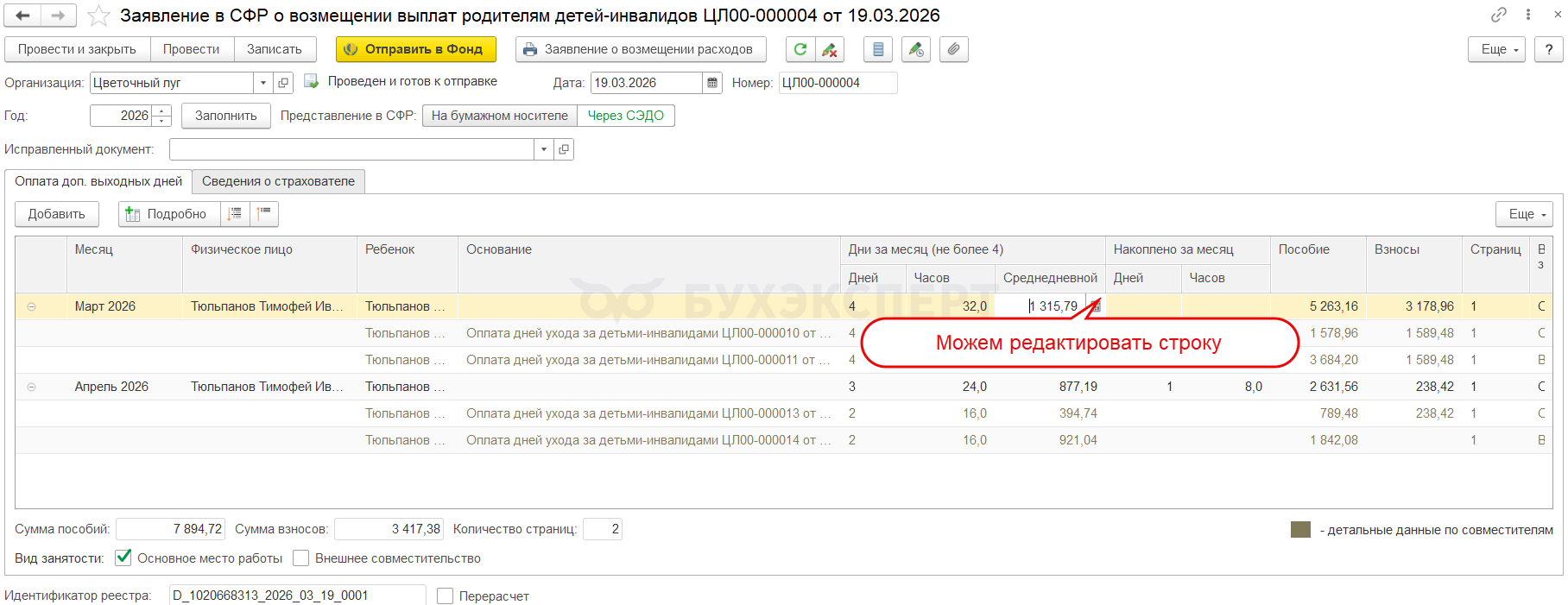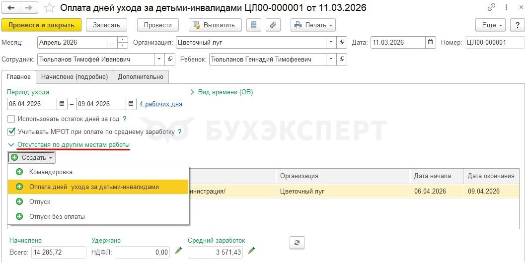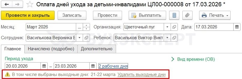 - Ввод периодов в документе оплата дней ухода за детьми-инвалидами