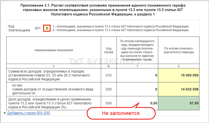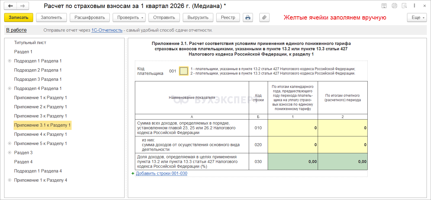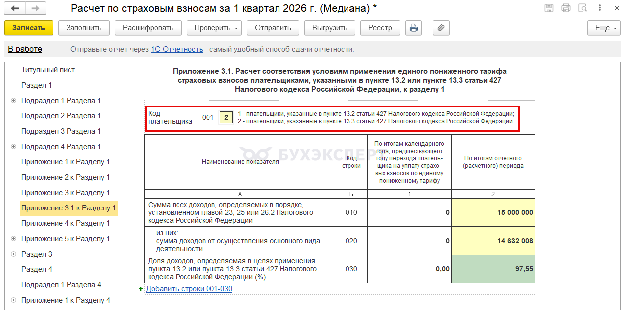 Приложение 3.1 к Разделу 1 с 2026 года также заполняют страхователи, указанные в п. 13.3 ст. 427 НК РФ – субъекты МСП из приоритетных отраслей. Раньше оно было предназначено только для работодателей МСП обрабатывающих производств. Приложение 3.1 предназначено для подтверждения права на льготный тариф – доля доходов от основной деятельности, которая дает право на льготу, не должна быть меньше 70% в общем объеме выручки.