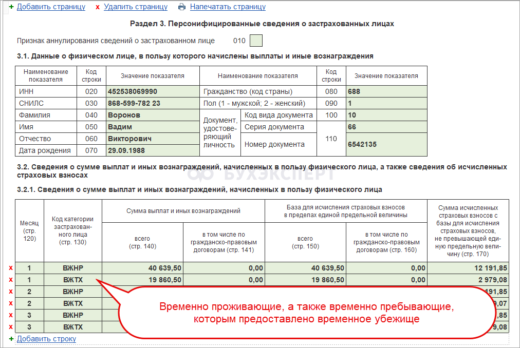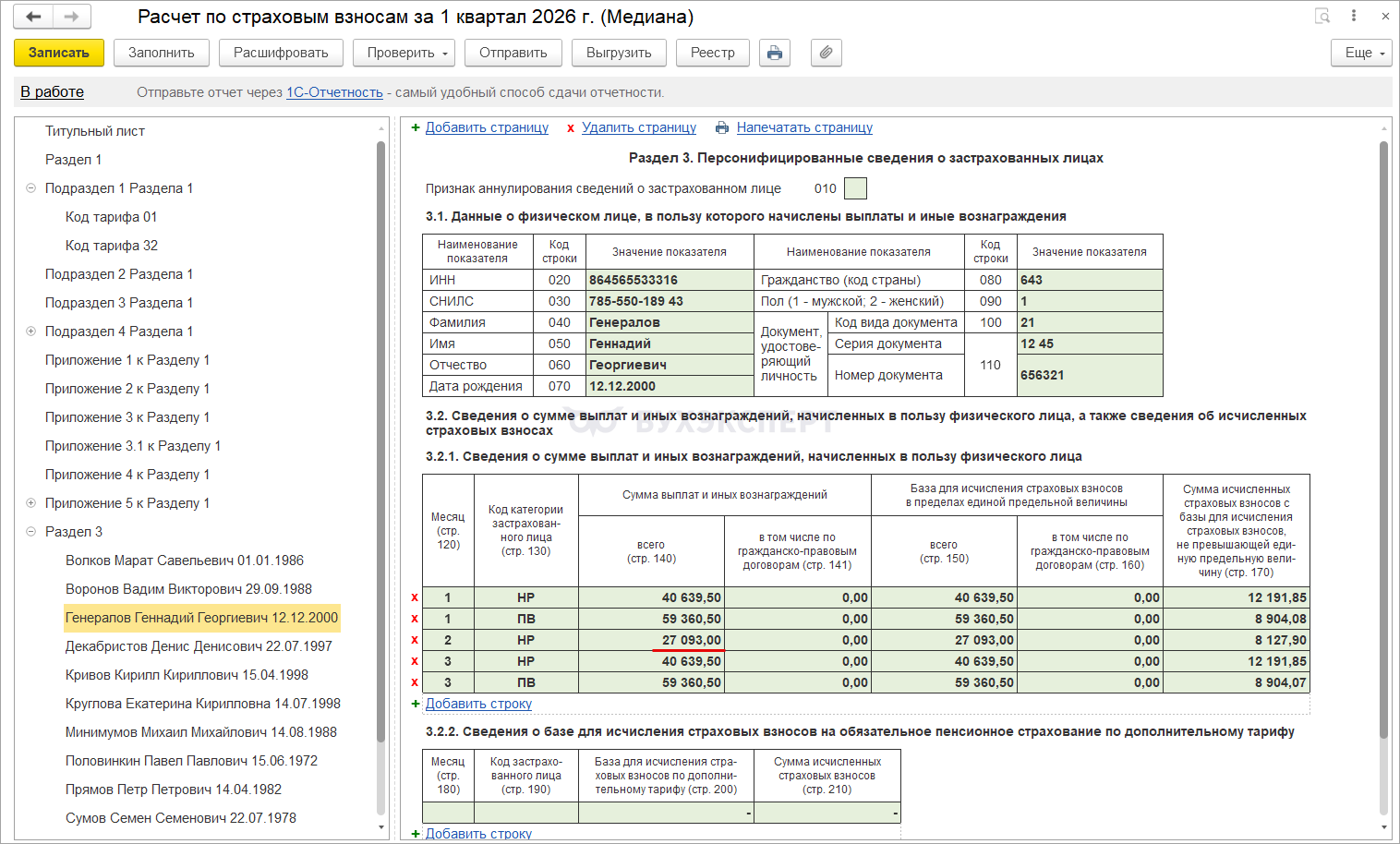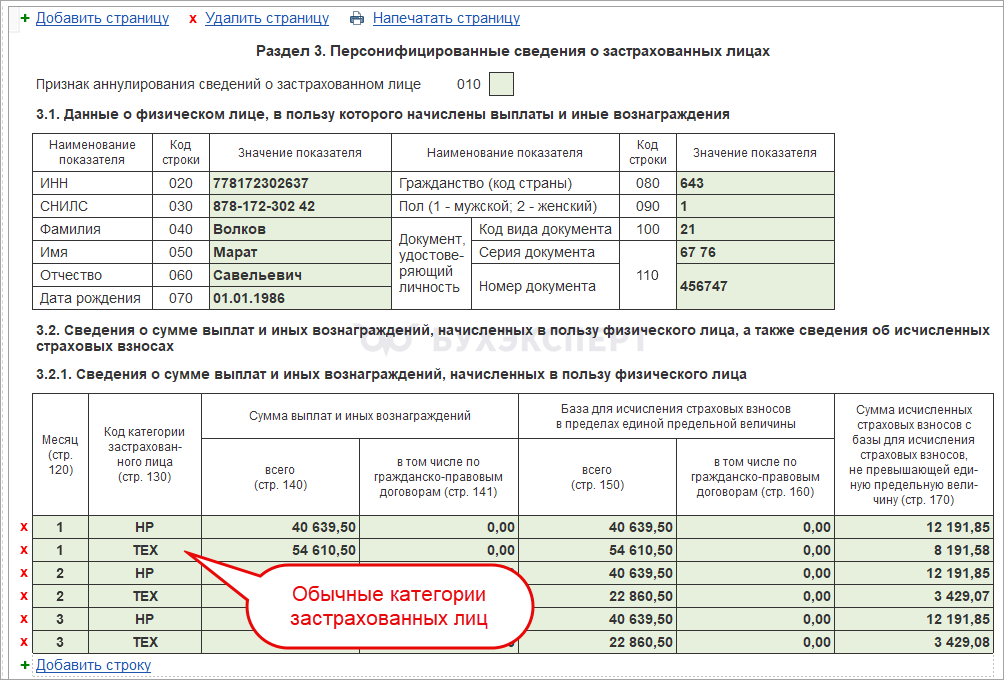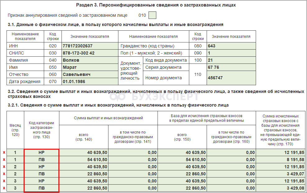 Коды категорий застрахованных лиц для в Разделе 3 для МСП из приоритетных отраслей также заполняются автоматически.