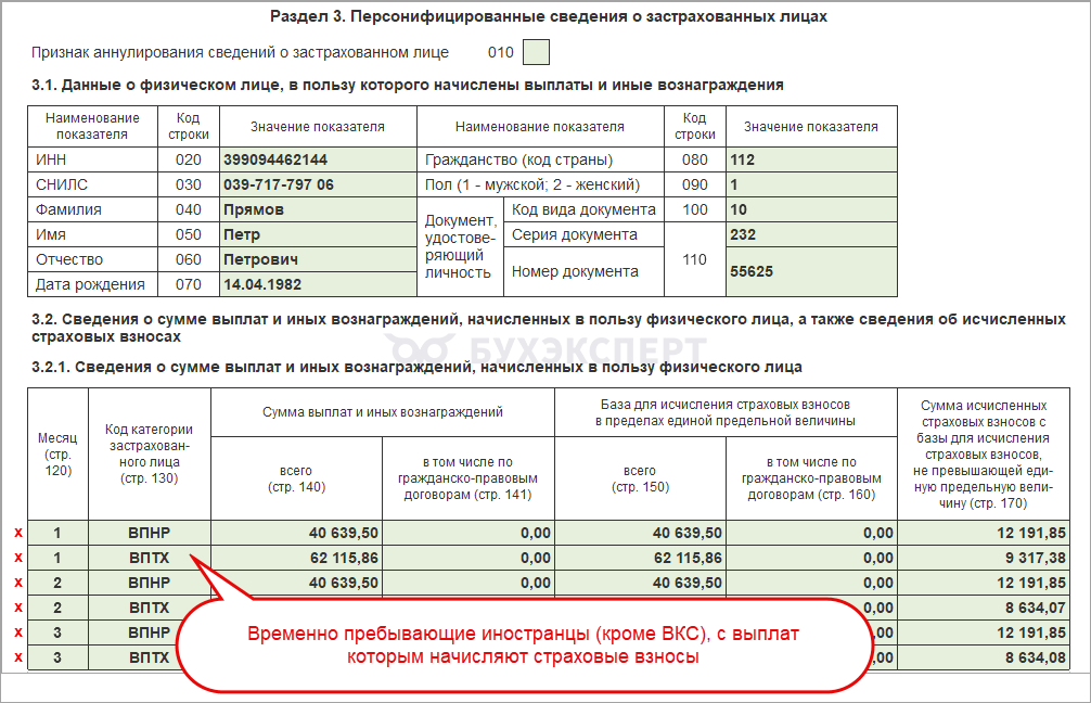 - ВППВ — иностранные граждане или лица без гражданства (за исключением ВКС), временно пребывающие на территории Российской Федерации, с выплат которым начисляются страховые взносы