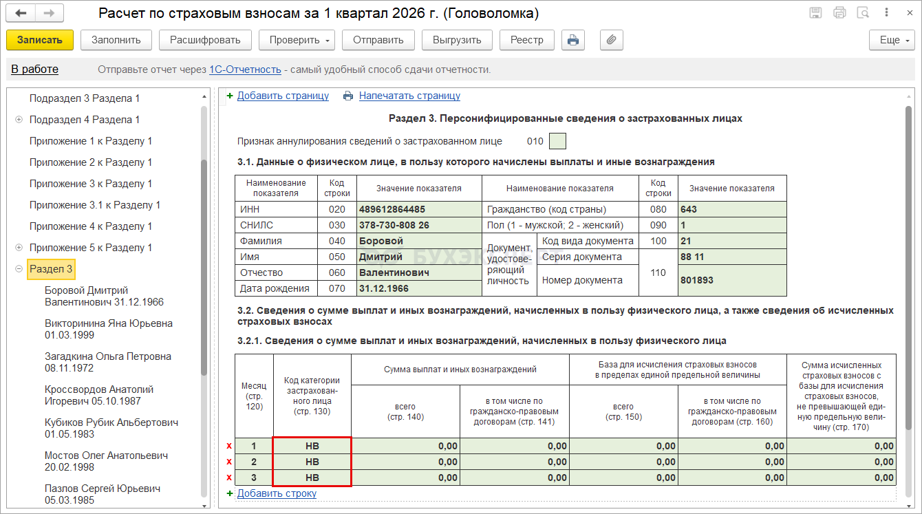 - в п. 13.2 рекомендуемого Порядка – «плательщик, который в последние три месяца расчетного (отчетного) периода фактически не осуществлял выплаты и иные вознаграждения в пользу физлиц (в отношении всех работников), при указании в строке 001 раздела 1 значения «2» по строке 130 подраздела 3.1 в сведениях о застрахованных лицах проставляет код категории застрахованного лица НВ».