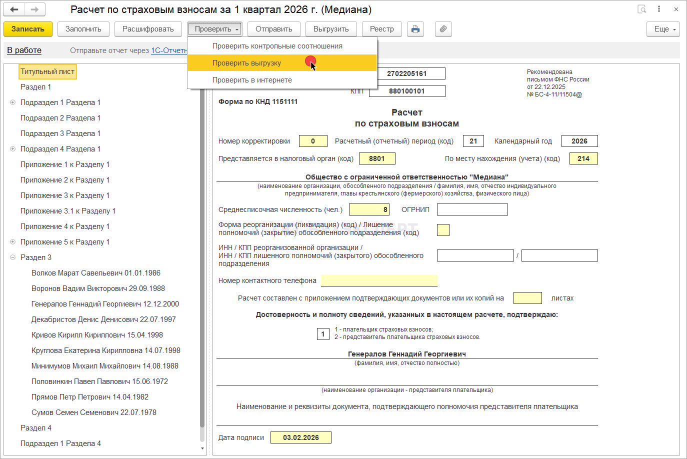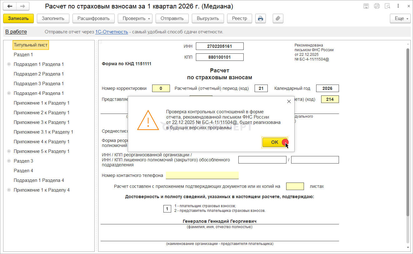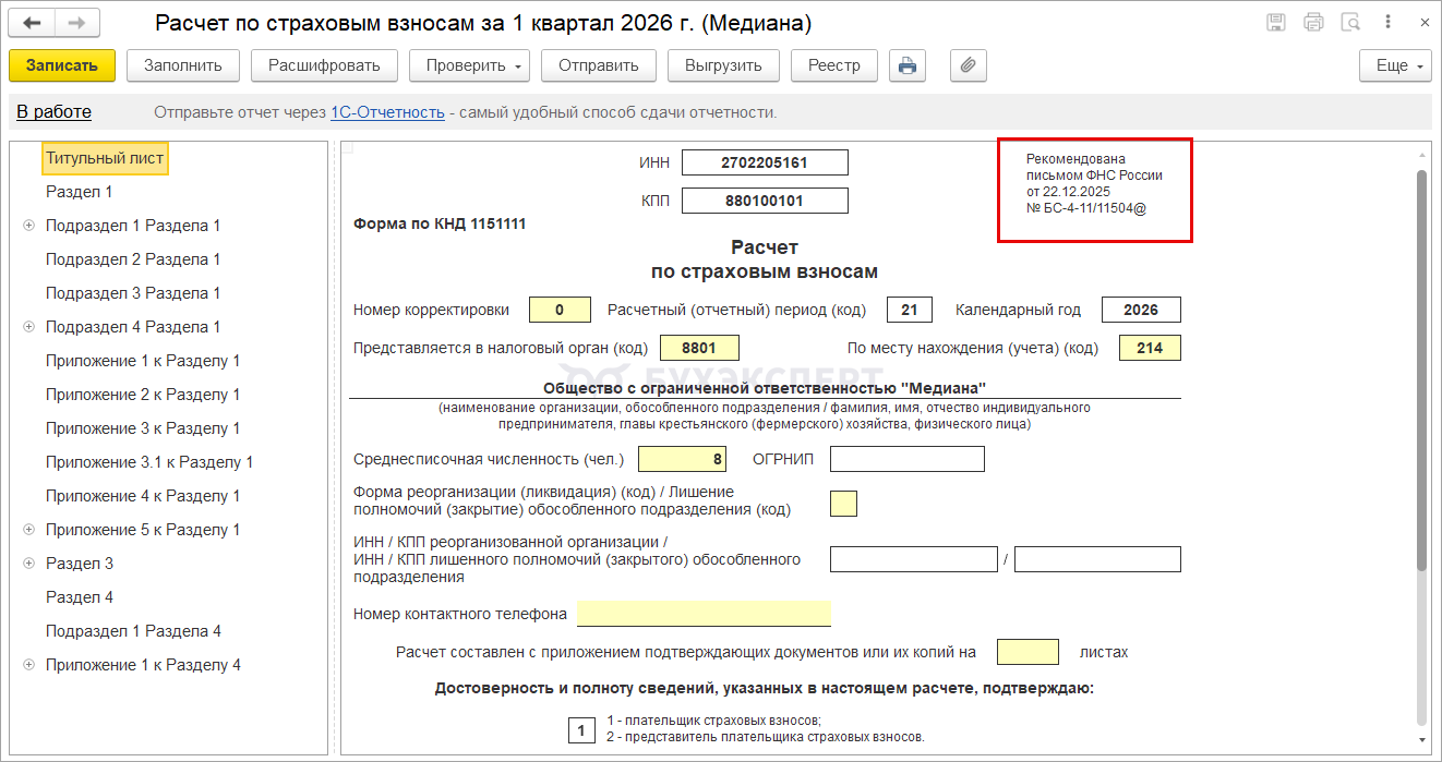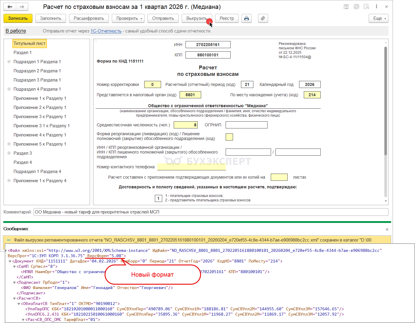Выгрузка новой формы происходит в формате версии 5.08 в соответствии рекомендуемым в Письме ФНС от 22.12.2025 N БС-4-11/11504@ форматом.