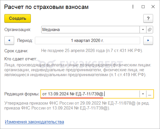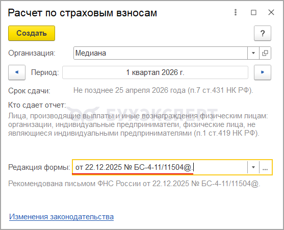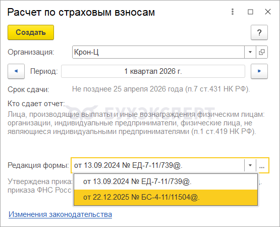 При заполнении отчета в программе есть возможность выбрать, по какой форме заполнить РСВ за 1 квартал 2026.
