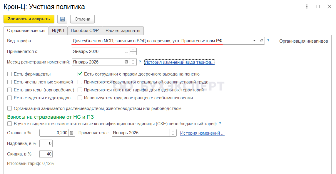 Чтобы правильно рассчитать взносы и заполнить РСВ за 1 квартал 2026 на льготном тарифе, в настройках Учетной политики с января 2026 выбираем вид тарифа Для субъектов МСП, занятых ВЭД по перечню, утв. Правительством РФ