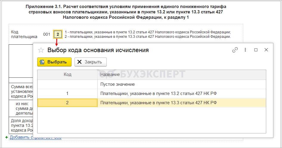 В поле Код плательщика работодатели – субъекты МСП из приоритетных отраслей выбирают код 2.