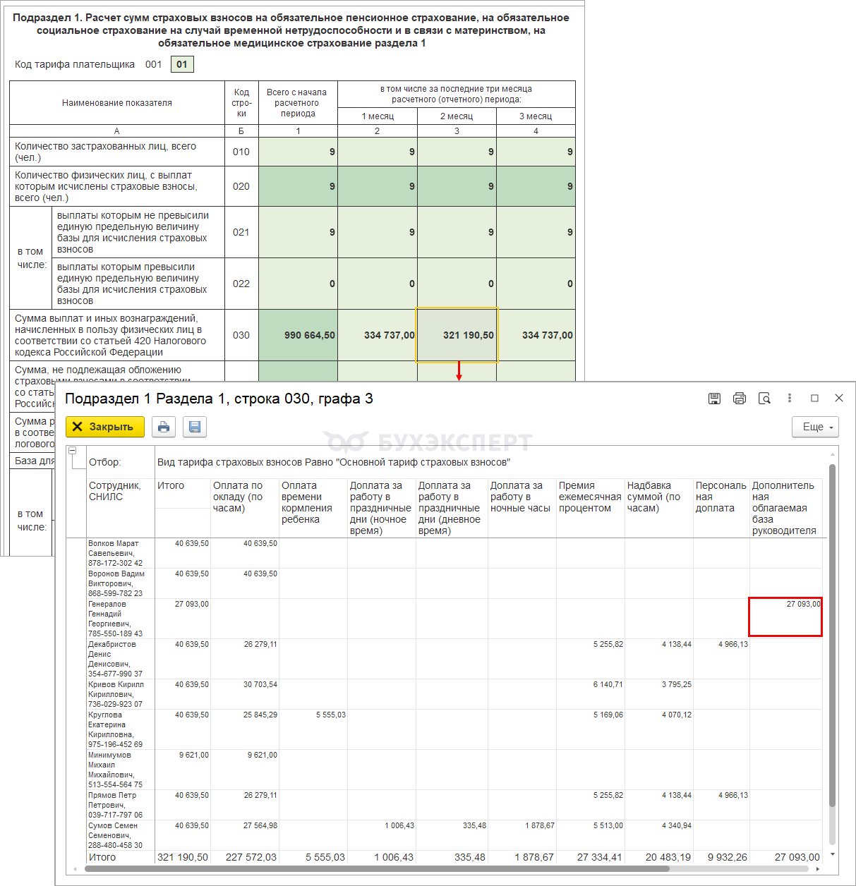 Если в каком-либо из месяцев отчетного периода облагаемые взносами доходы руководителя оказалась менее МРОТ, то облагаемую базу по взносам увеличиваем до МРОТ специальным документом Регистрация облагаемой базы руководителя (Налоги и взносы – Регистрации облагаемой базы руководителя). Подробнее об этом – в статье Взносы за директора 2026 с доходов не менее МРОТ (ЗУП 3.1.34.172 / 3.1.36.39).