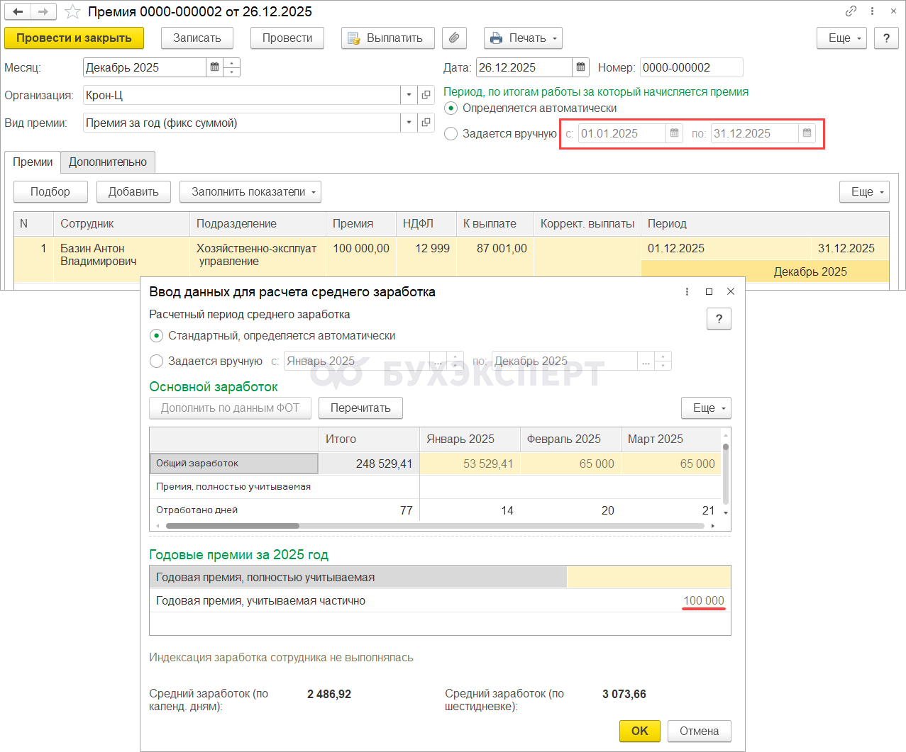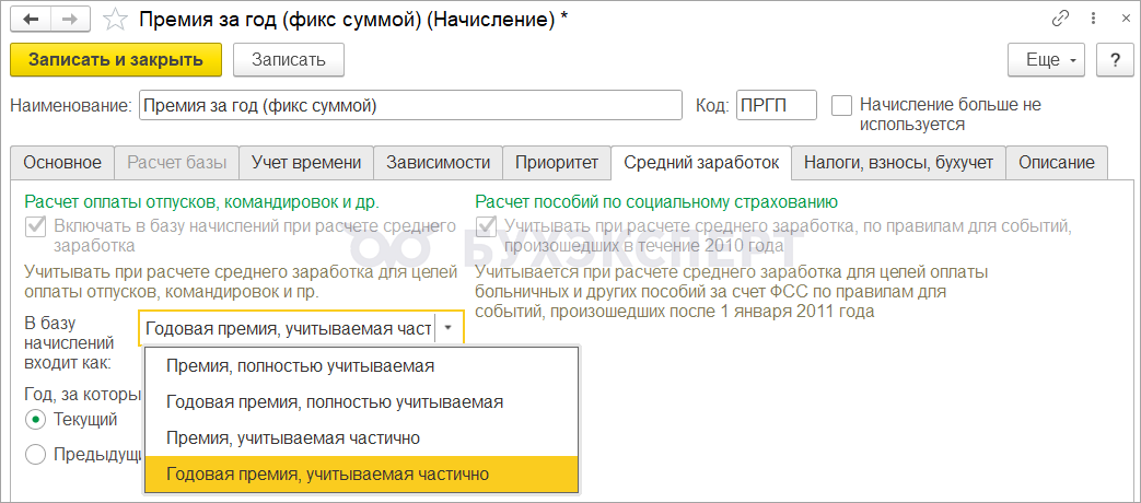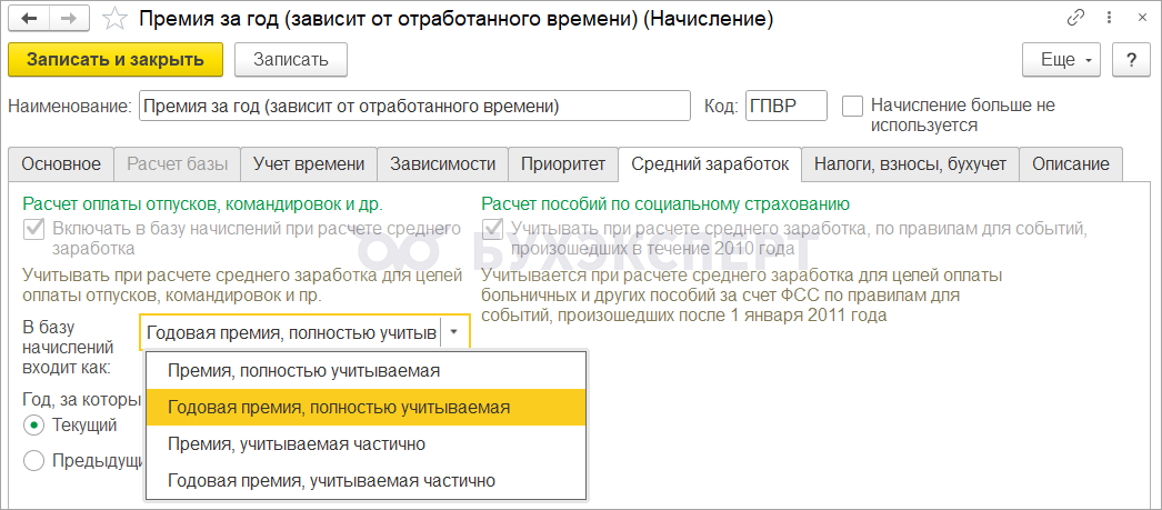 Перед тем, как начислить премию по итогам работы за год, обратите внимание на настройки начисления премии на вкладке Средний заработок: