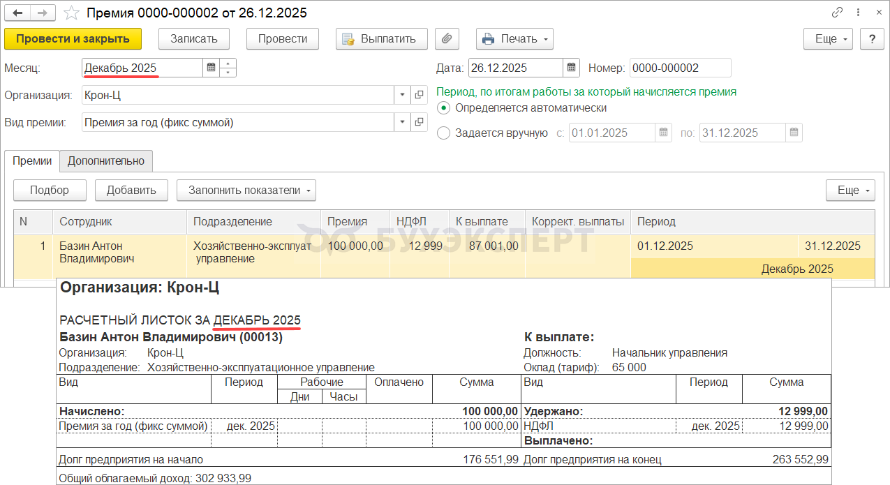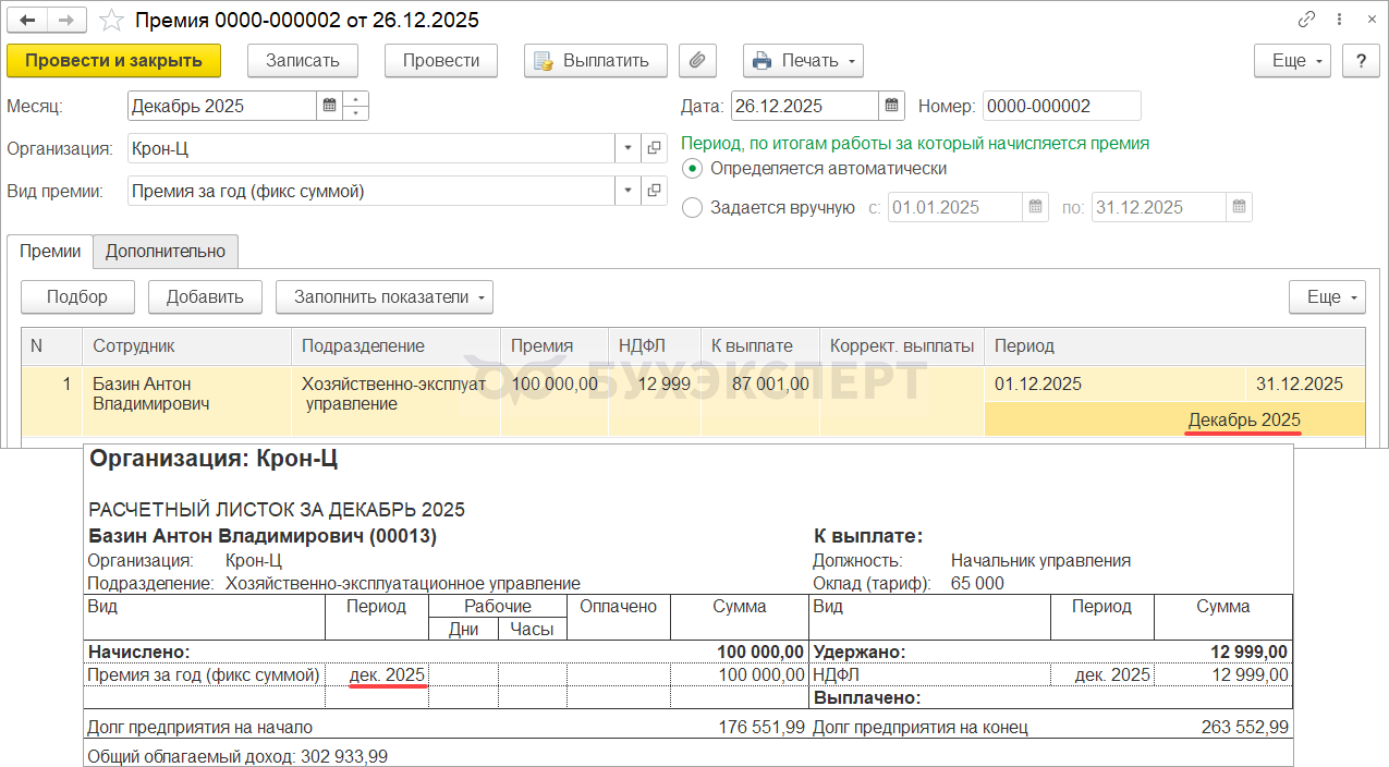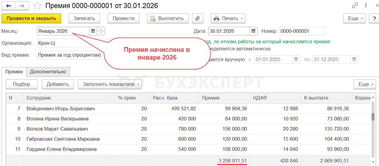 Годовые премии, как правило, начисляем отдельным документом Премия. При заполнении документа важно обратить внимание на то, как заполнились периоды для премий: