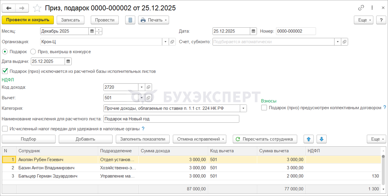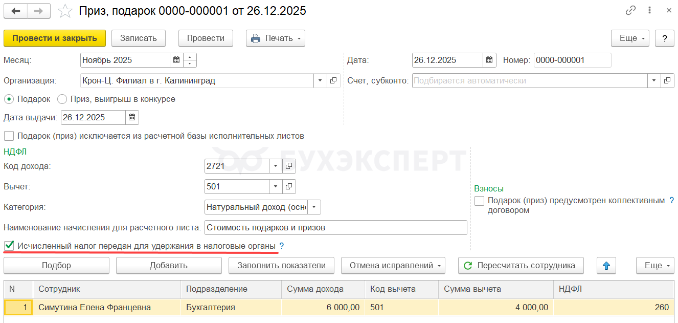 - Для подарка в натуральной форме используем типовой документ Приз, подарок (Зарплата – См. также – Призы, подарки)