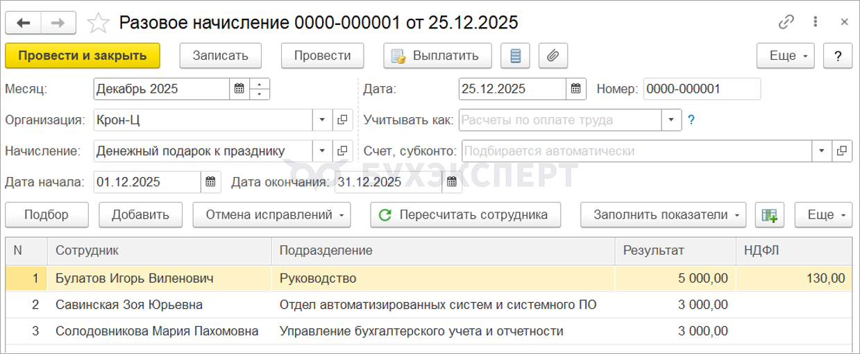 - Для подарка в денежной форме настраиваем отдельное начисление и рассчитываем его в документе Разовое начисление (Зарплата — Разовые начисления)