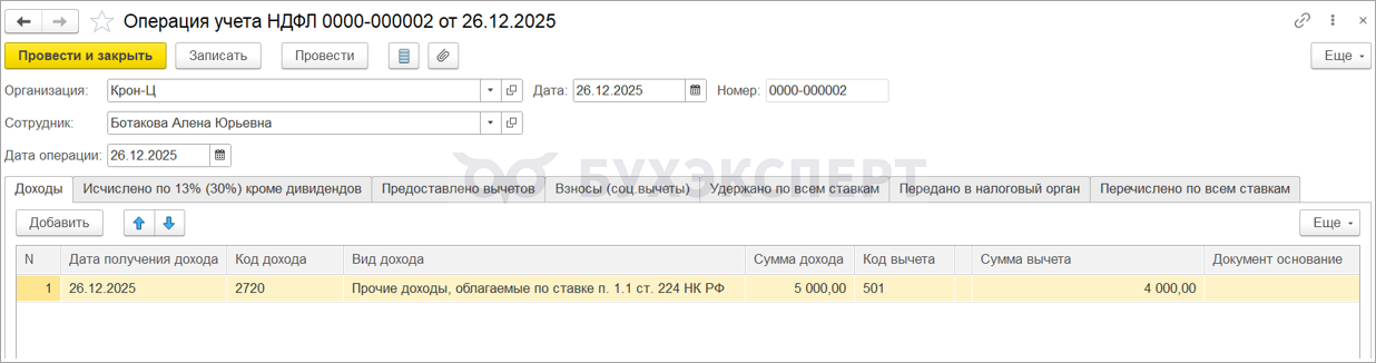 - Если стороннему физлицу выплачиваем денежные доходы или сам подарок выдан в денежной форме, то с него получится удержать НДФЛ. Удержанный НДФЛ с подарка отражаем в документе Операция учета НДФЛ на вкладке Удержано по всем ставкам