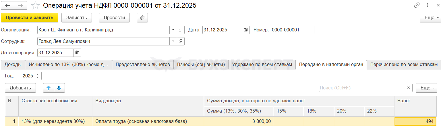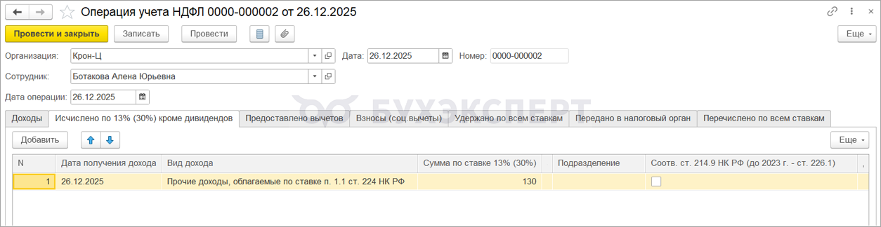 - На вкладке Исчислено по 13% (30%) кроме дивидендов отражаем исчисленный налог