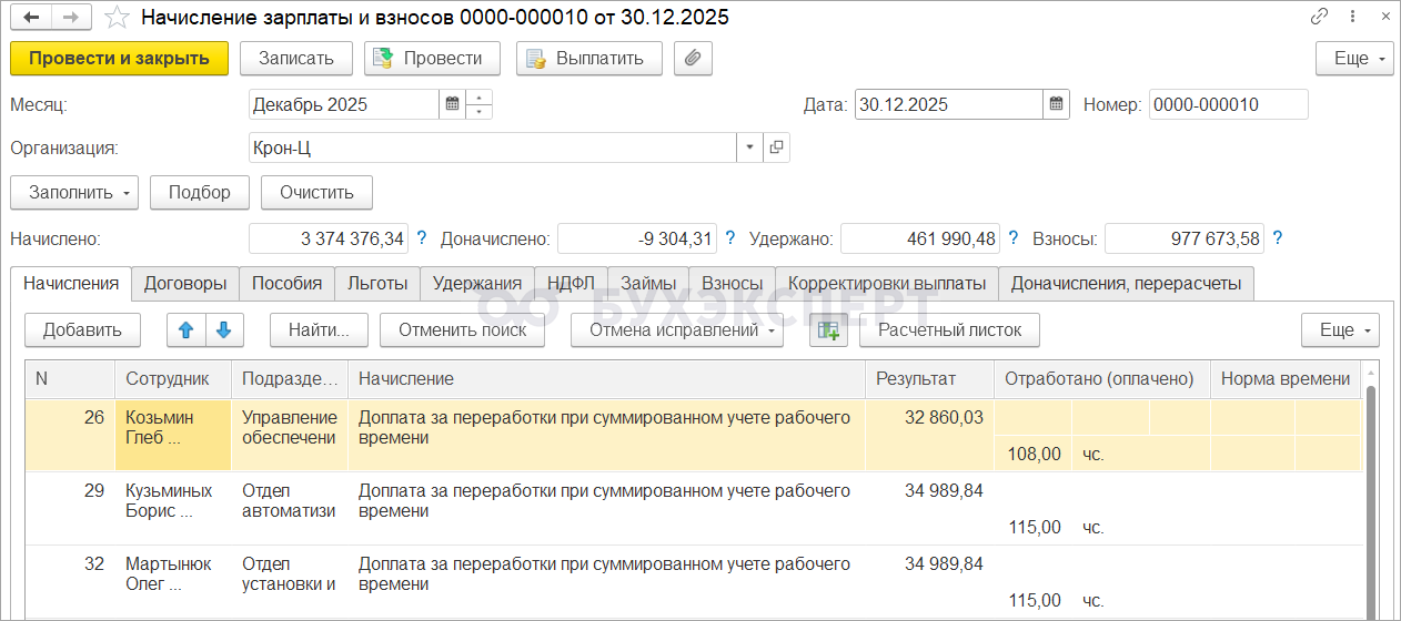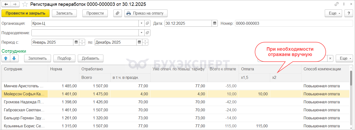 После того, как отразим часы переработки документом Регистрация переработок, доплата за часы переработки автоматически рассчитается в документе Начисление зарплаты и взносов.
