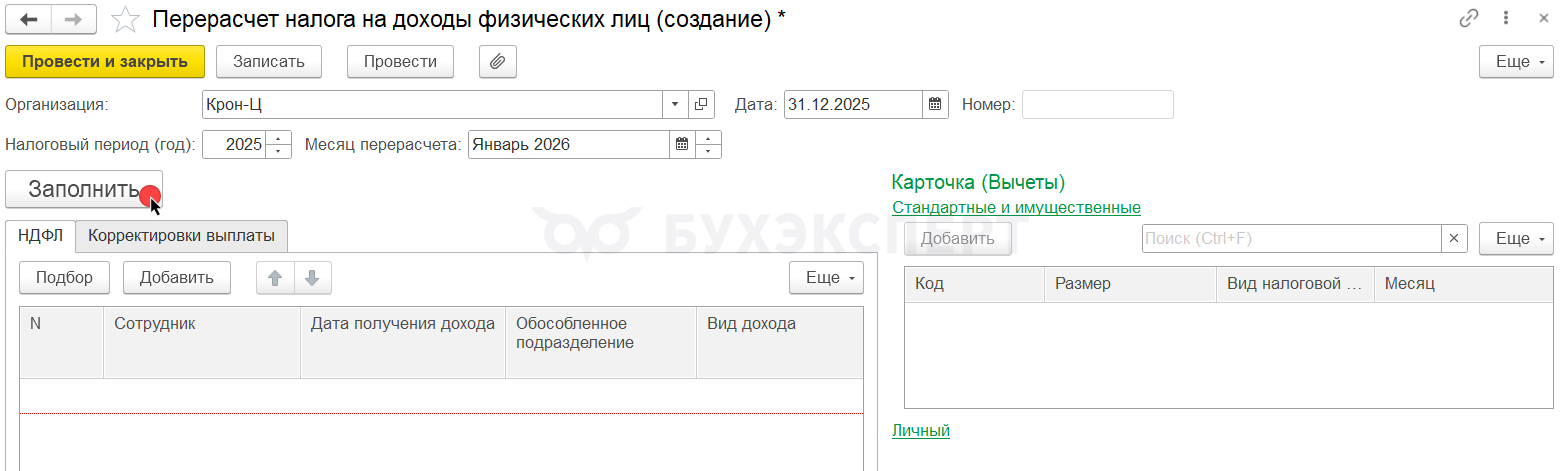 Документ формируется 1 раз в месяц перед выполнением синхронизации с бухгалтерской программой и заполняется автоматически по команде Заполнить.