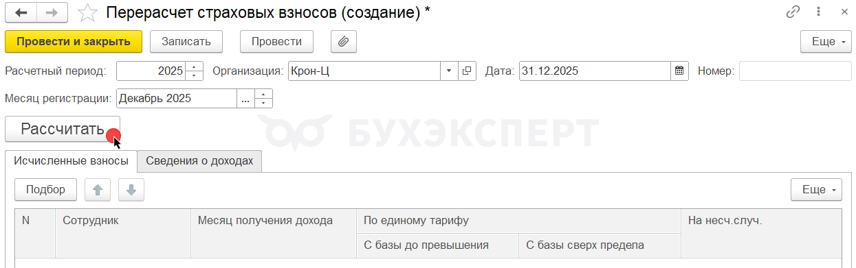 Для проверки расчета страховых взносов в 2025 году можно ввести документ Перерасчет страховых взносов (Налоги и взносы – Перерасчеты страховых взносов). Заполняем документ автоматически по команде Рассчитать и, если по сотрудникам заполнятся суммы взносов, анализируем их.