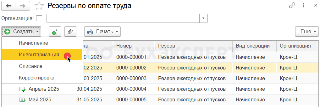 - Потом документ Резервы по оплате труда с типом Инвентаризация