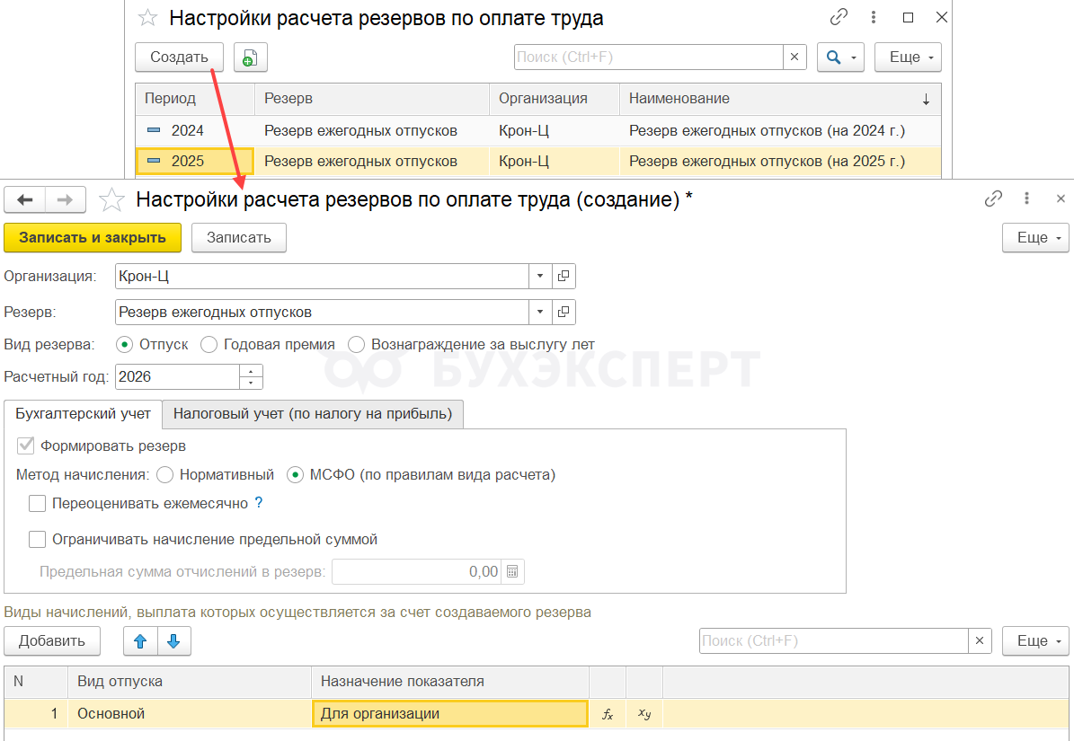 Настройку резерва отпусков нужно делать на каждый год. На 2026 год вводим новую настройку резерва в настройках учетной политики организации (Настройка – Организация – Учетная политика и другие настройки – Резервы по оплате труда).