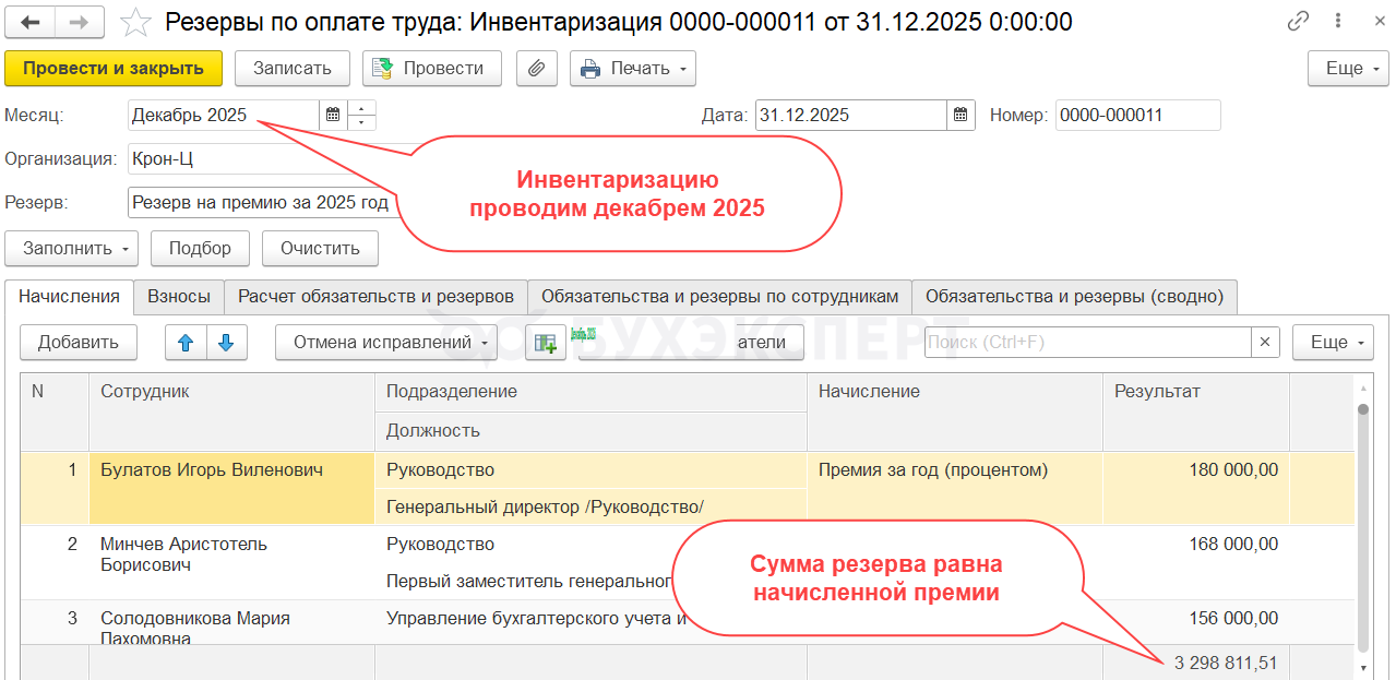 Инвентаризация премии проводится после ее начисления, но месяцем Декабрь 2025. Для этого используем документ Резервы по оплате труда с типом Инвентаризация.