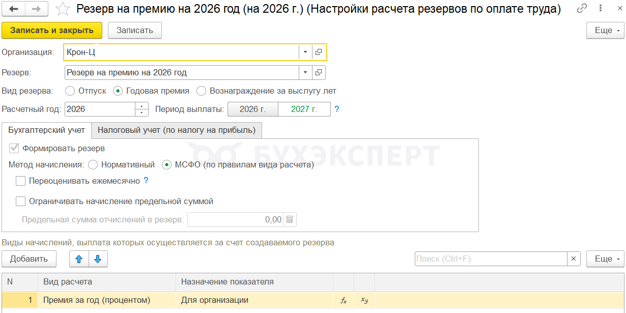 На 2026 год вводим новую настройку резерва в настройках учетной политики организации.