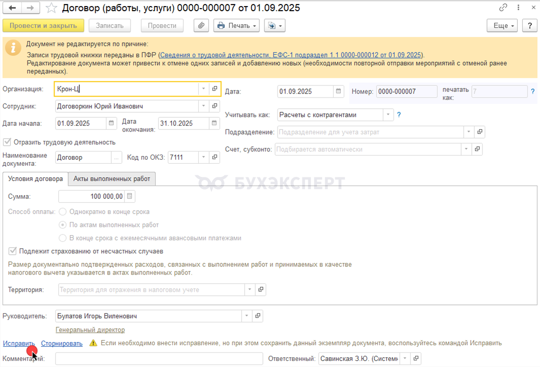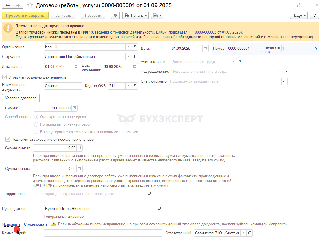 - Откроем исходный документ Договор (работы, услуги) и по ссылке Исправить создадим документ-исправление