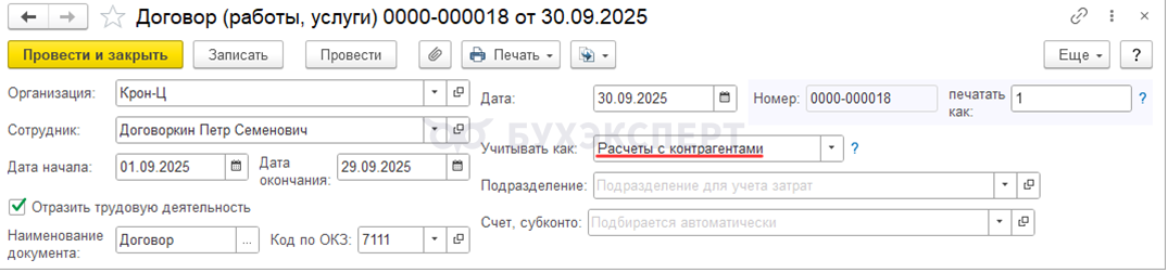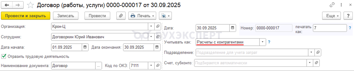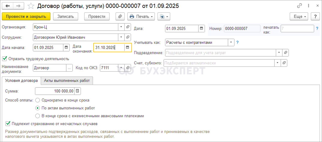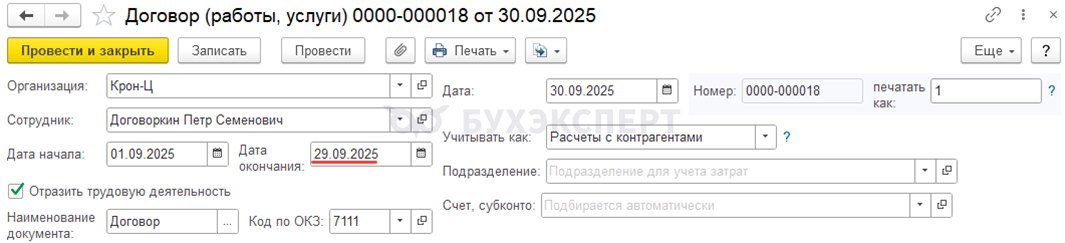 С Договоркиным Ю.И. заключен договор ГПХ с 01.09.2025 по 31.10.2025.