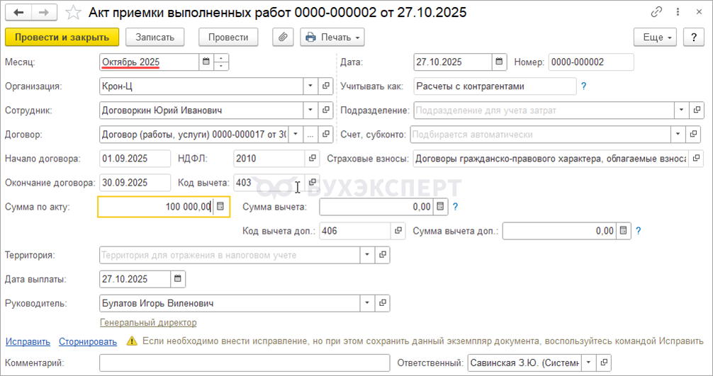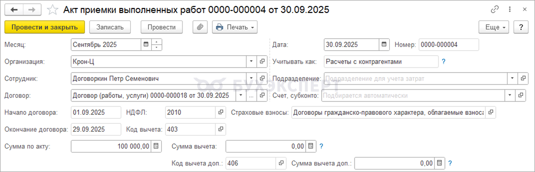 Рассмотрим, как отразить смерть исполнитель по договору ГПХ, начислить вознаграждение по договору и настроить обложение НДФЛ и взносами, если о смерти договорника в прошлом месяце узнали только в текущем месяце. При этом начисление по договору нужно провести текущим месяцем.