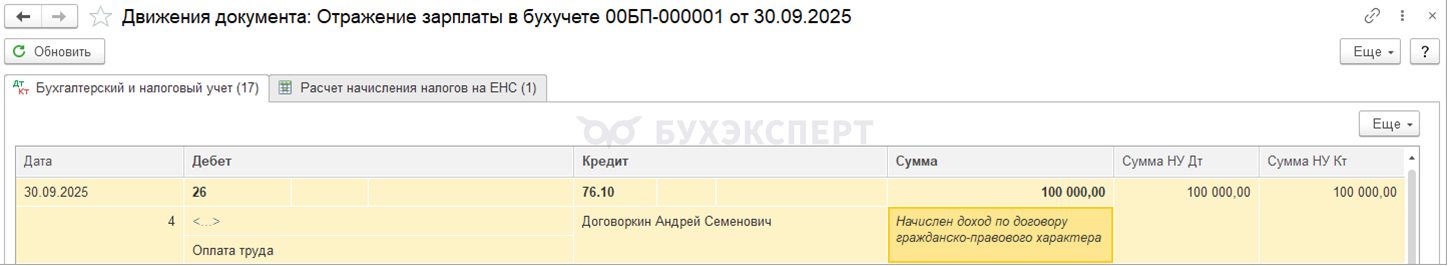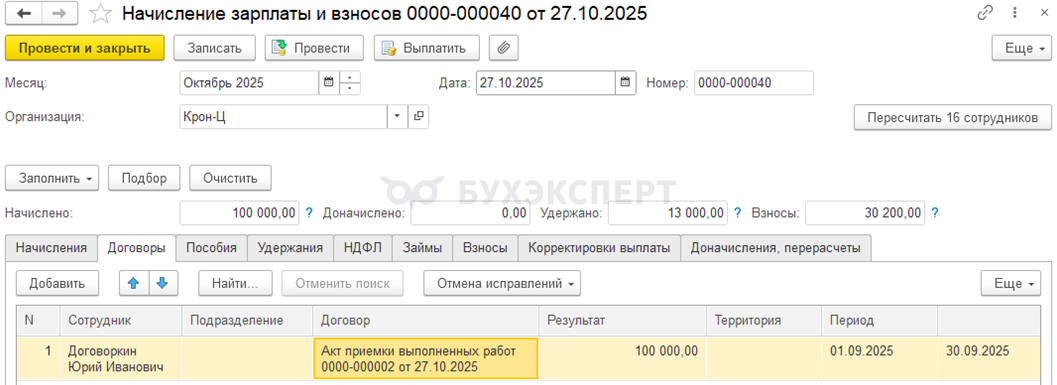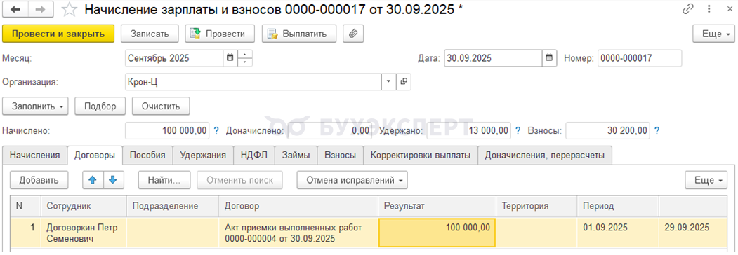 - Выполним начисление по договору. В результате в текущем месяце происходит начисление по договору за прошлый месяц. Вознаграждение по договору ГПХ автоматически включится в базу по НДФЛ и взносам.