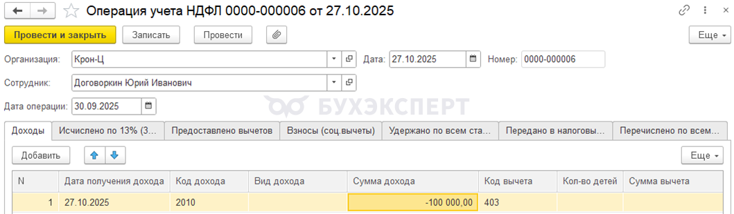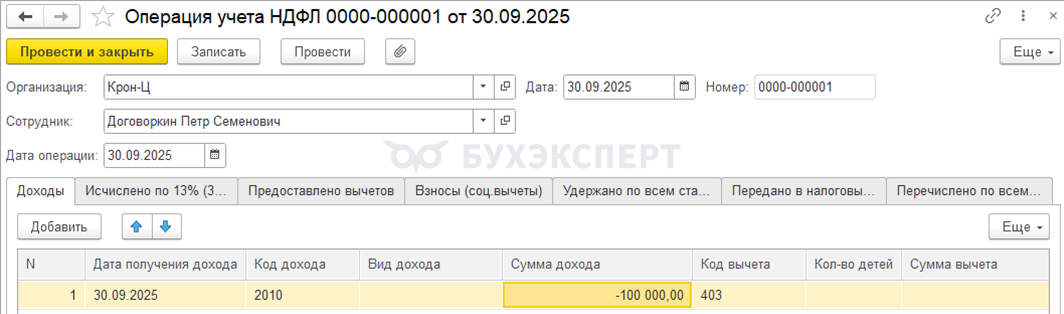 - Для целей НДФЛ обнулим доход документом Операция учета НДФЛ. Для этого на вкладке Доходы укажем сумму оплаты по договору с минусом. В качестве даты получения дохода и даты операции укажем планируемую дату выплаты вознаграждения по договору