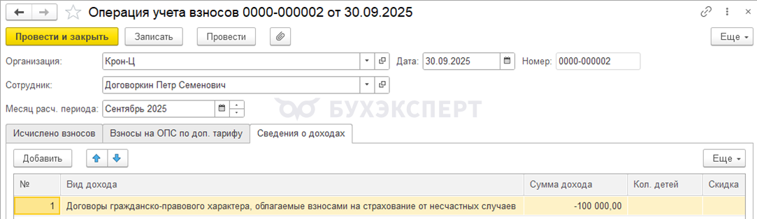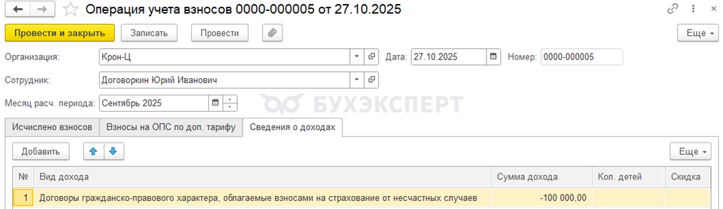 - Чтобы исключить сумму по договору из обложения взносами, введем документ Операция учета взносов. На вкладке Сведения о доходах укажем сумму оплаты по договору с минусом