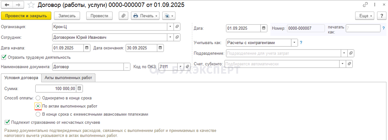 Если в изначально в договоре указан способ оплаты не по актам выполненных работ, а в конце срока, и начислить вознаграждение нужно уже в следующем месяце после окончания договора из-за смерти исполнителя, то придется изменить способ оплаты по договору — выбрать вариант По актам выполненных работ. Такие изменения нельзя внести в документе-исправлении, поэтому исправить способ оплаты придется в исходном Договоре (работы, услуги).