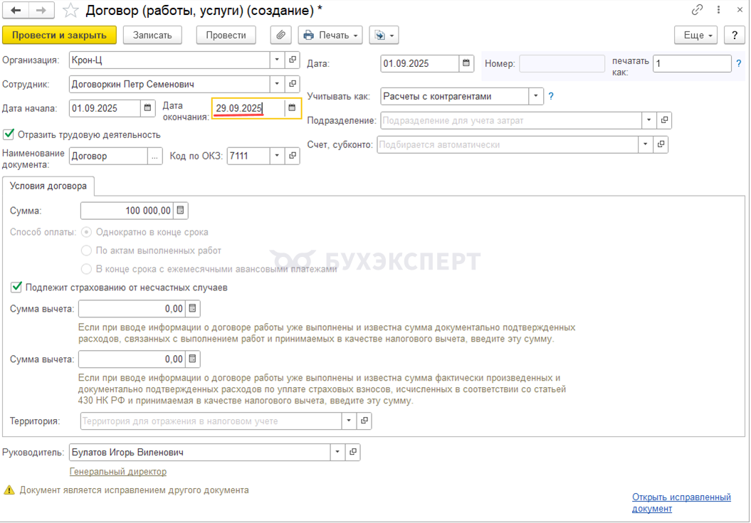 В документе-исправлении укажем в поле Дата окончания дату смерти исполнителя по договору. При этом Дата документа Договор (работы, услуги) была изначально указана правильно. Поэтому в документе-исправлении важно указать такую же дату документа, которая была изначально.