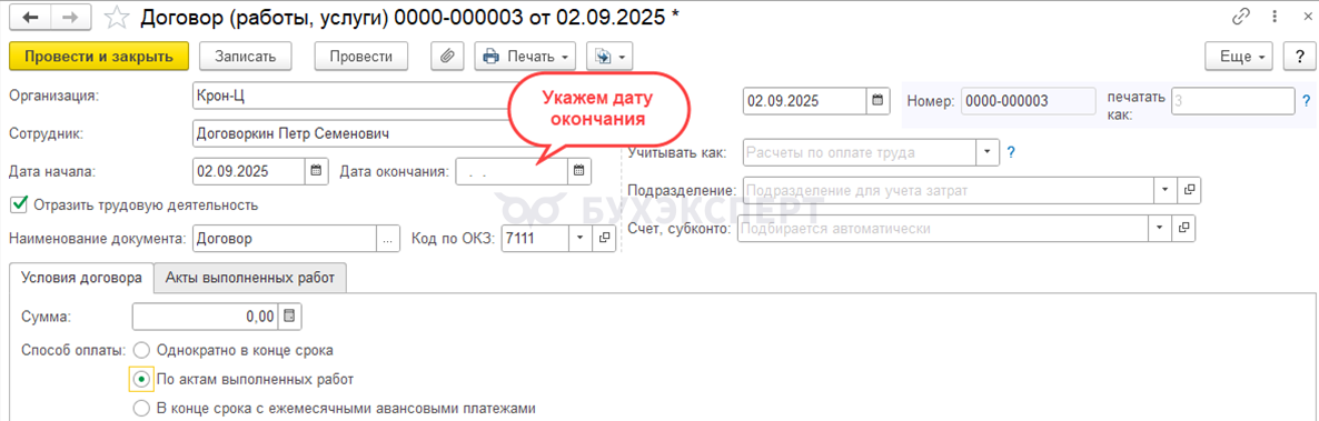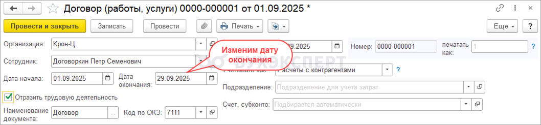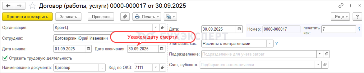 - Если изначально в договоре была указана дата окончания, то изменим ее. Для этого укажем в поле Дата окончания дату смерти исполнителя по договору