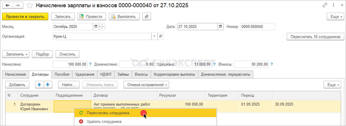 - После того, как скорректируем учет НДФЛ и взносов, пересчитаем документ Начисление зарплаты и взносов.