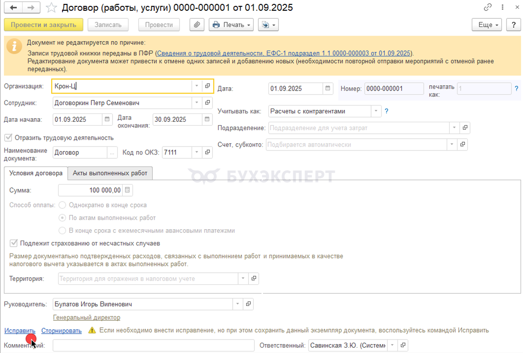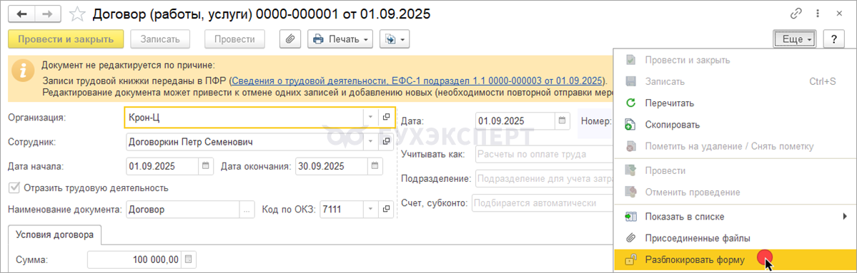 Этот вариант подойдет, если договор создан недавно и допустимо его менять. Откроем исходный документ Договор (работы, услуги). Он будет заблокирован, если по нему уже сдали Подраздел 1.1 ЕФС-1. Разблокируем документ по кнопке Еще — Разблокировать форму.