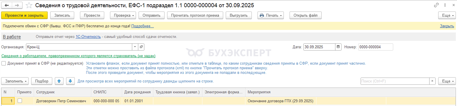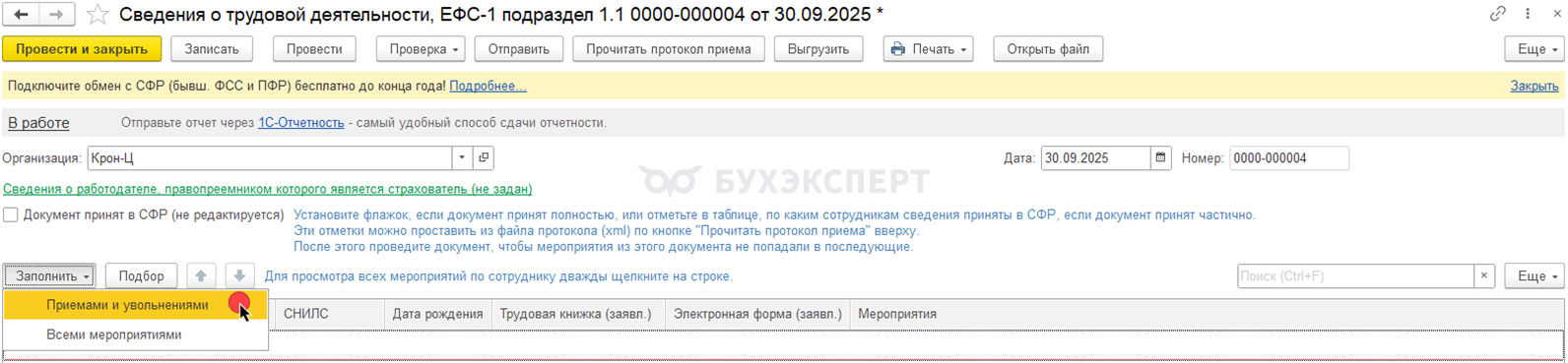 После изменения даты окончания договора ГПХ заполним Подраздел 1.1 ЕФС-1. Создадим новый документ Сведения о трудовой деятельности, ЕФС-1 подраздел 1.1 (Кадры — См. также — Электронные трудовые книжки) и заполним его по кнопке Заполнить — Приемами и увольнениями.