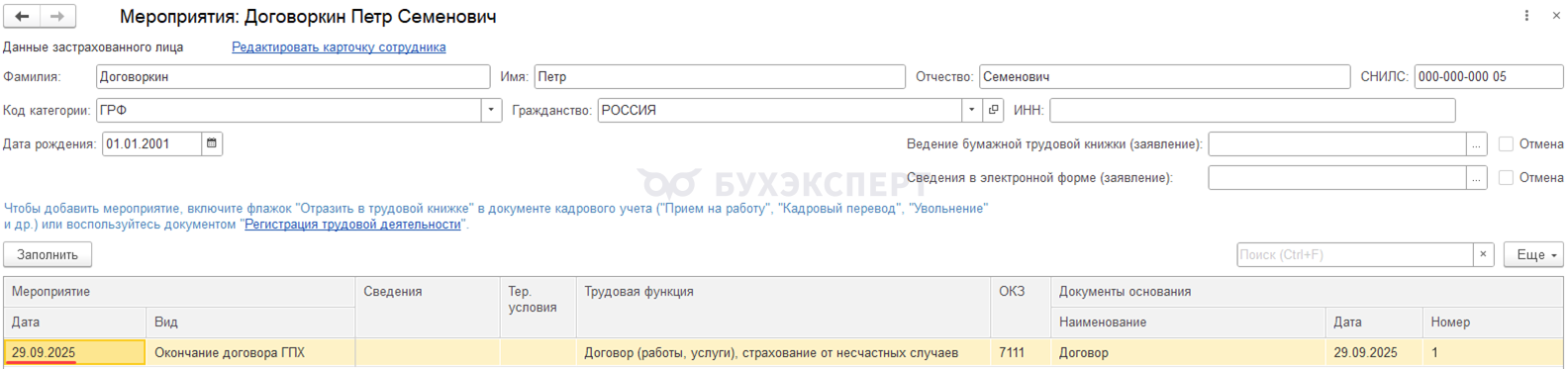 В документ автоматически попадет мероприятие Окончание договора ГПХ. В нашем случае исполнитель по договору умер раньше, чем планировалось изначально завершить действие договора. Поэтому дата окончания договора совпадает с датой смерти договорника.