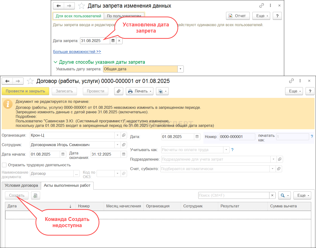 В ЗУП 3.1 обнаружена ошибка – невозможно создать Акты выполненных работ из документа Договор (работы, услуги) или Договор авторского заказа, если установлена дата запрета изменений.
