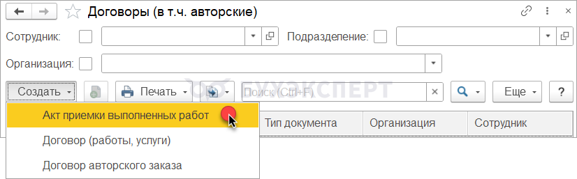 Это программная ошибка 70127285. Она проявляется, когда установлена дата запрета редактирования данных. Если документ Договор (работы, услуги) или Договор авторского заказа попадает в запрещенный период, то на вкладке Акты выполненных работ неактивна команда Создать. Получается, что сам договор еще действует и по нему нужно вводить Акты, но невозможно сделать это напрямую из документа Договор (работы, услуги) или Договор авторского заказа.